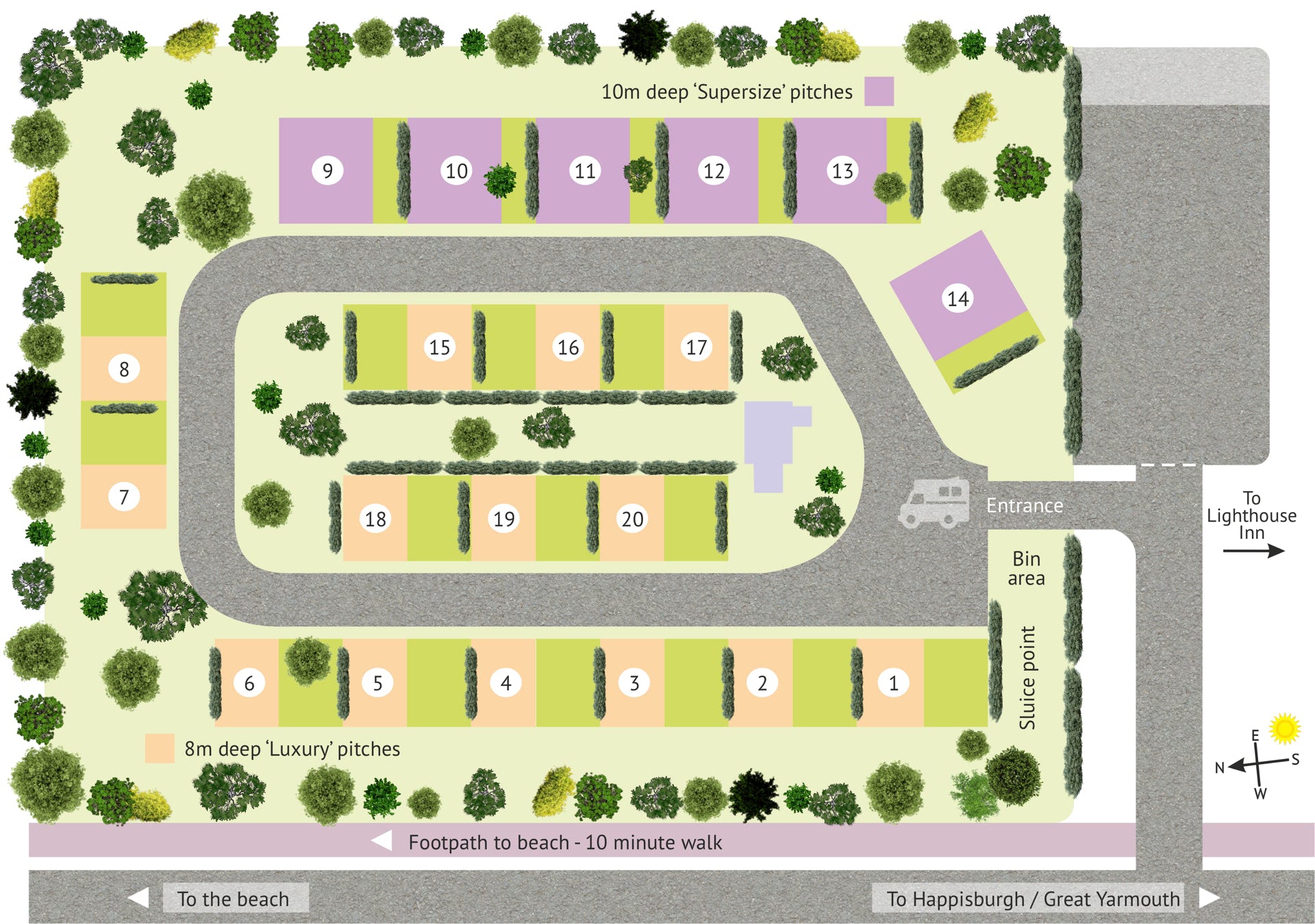 Hover your mouse over each of the pitches to find more details and to book. For motorhome refresh click pitch 1.